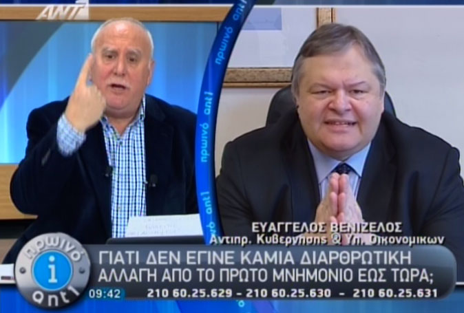 «Το πρόγραμμα στήριξης της ελληνικής οικονομίας έχει δύο κεφάλαια, τη δημοσιονομική προσαρμογή, να περιοριστούν τα ελλείμματα και οι διαρθρωτικές αλλαγές, η συμφωνία με τους εταίρους είναι σχετικά απλή, λένε ότι θα μας βοηθήσουν με το χρέος και μας ζητάνε να μειώσουμε το έλλειμμα» δήλωσε ο Ευ. Βενιζέλος. Στο θέμα των διαρθρωτικών αλλαγών έχουμε συμφέρον να τα κάνουμε όλα. Στο θέμα της δημοσιονομικής προσαρμογής είναι θετικό ότι αφαιρούμε 105 δισ. χρέους, όμως στο δημοσιονομικό έλλειμμα η προσαρμογή πρέπει να γίνει άμεσα και ασκούν πίεση να γίνουν πολλά πράγματα σε μικρό χρονικό διάστημα. Όμως μας πληρώνουν για να καλύπτουμε τα ελλείμματά μας, εάν δεν υπήρχε ο μηχανισμός στήριξης θα έπρεπε να ζήσουμε με αυτά που παράγουμε, δηλαδή σε δραματικές περικοπές μειώσεις και συντάξεων.
