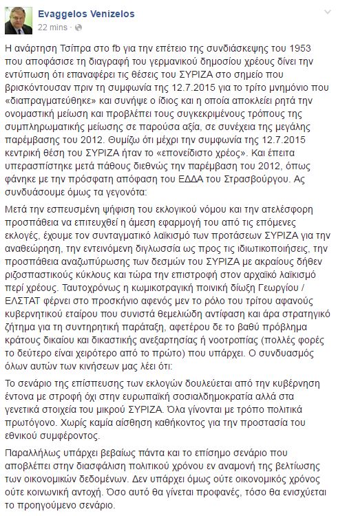 «Η ανάρτηση Τσίπρα στο fb για την επέτειο της συνδιάσκεψης του 1953 που αποφάσισε τη διαγραφή του γερμανικού δημοσίου χρέους δίνει την εντύπωση ότι επαναφέρει τις θέσεις του ΣΥΡΙΖΑ στο σημείο που βρισκόντουσαν πριν τη συμφωνία της 12.7.2015 για το τρίτο μνημόνιο που «διαπραγματεύθηκε» και συνήψε ο ίδιος και η οποία αποκλείει ρητά την ονομαστική μείωση και προβλέπει τους συγκεκριμένους τρόπους της συμπληρωματικής μείωσης σε παρούσα αξία, σε συνέχεια της μεγάλης παρέμβασης του 2012», έγραψε αρχικά και συνέχισε: