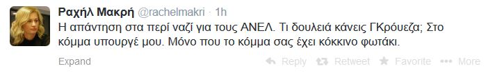 “Η απάντηση στα περί ναζί για τους ΑΝΕΛ. Τι δουλειά κάνεις ΓΚρόυεζα; Στο κόμμα υπουργέ μου. Μόνο που το κόμμα σας έχει κόκκινο φωτάκι” έγραψε στο Twitter της βουλευτής των ΑΝ.ΕΛ. απαντώντας στην Αφροδίτη Αλ Σάλεχ.