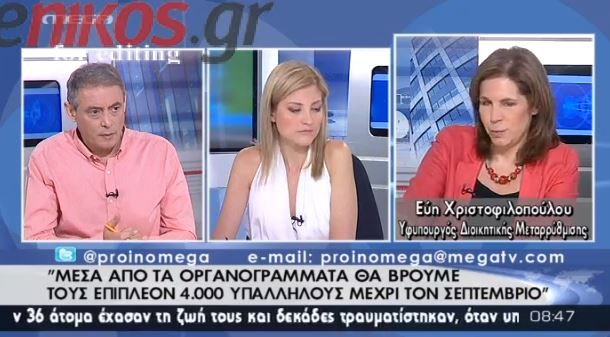 «Μέσα από τα οργανογράμματα θα βρούμε τους επιπλέον 4.000 υπαλλήλους, μέχρι το Σεπτέμβριο», δήλωσε, μεταξύ άλλων, η υφυπουργός Διοικητικής Μεταρρύθμισης, Εύη Χριστοφιλοπούλου, μιλώντας στην εκπομπή του MEGA για την κινητικότητα, τη διαθεσιμότητα και τις απολύσεις.