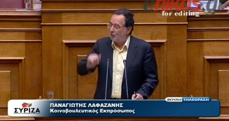 Σχολιάζοντας στην ομιλία του την απόφαση της κυβέρνησης με την οποία δεν θα απολυθούνοι σχολικοί φύλακες, που έχουν διδακτορικό, ο Παναγιώτης Λαφαζάνης έκανε το εξής σχόλιο: “Προτείνω να μην απολυθούν και όσοι κάνουν τα 100 μέτρα κάτω από 9 δευτερόλεπτα”.