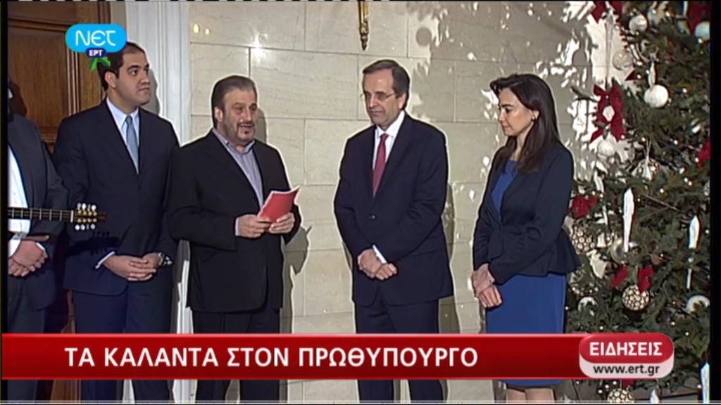 Πρώτη φορά άκουσε ως πρωθυπουργός στο μέγαρο Μαξίμου τα κάλαντα ο Αντώνης Σαμαράς. Μαζί με την σύζυγό του Γεωργία άκουσαν τα κάλαντα κι έδωσαν συμβολικά δώρα στον Πολιτιστικό Σύλλογο Χαλκίδας και στον Ομιλο Βρακοφόρων Κρήτης.