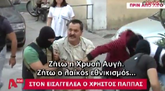 Συνθήματα προς τι�� κάμερες φώναξε ο βουλευτής της Χρυσής Αυγής Χρήστος Παππάς, κατά την έξοδό του από τη ΓΑΔΑ και κατά την άφιξή του στην Ευελπίδων.