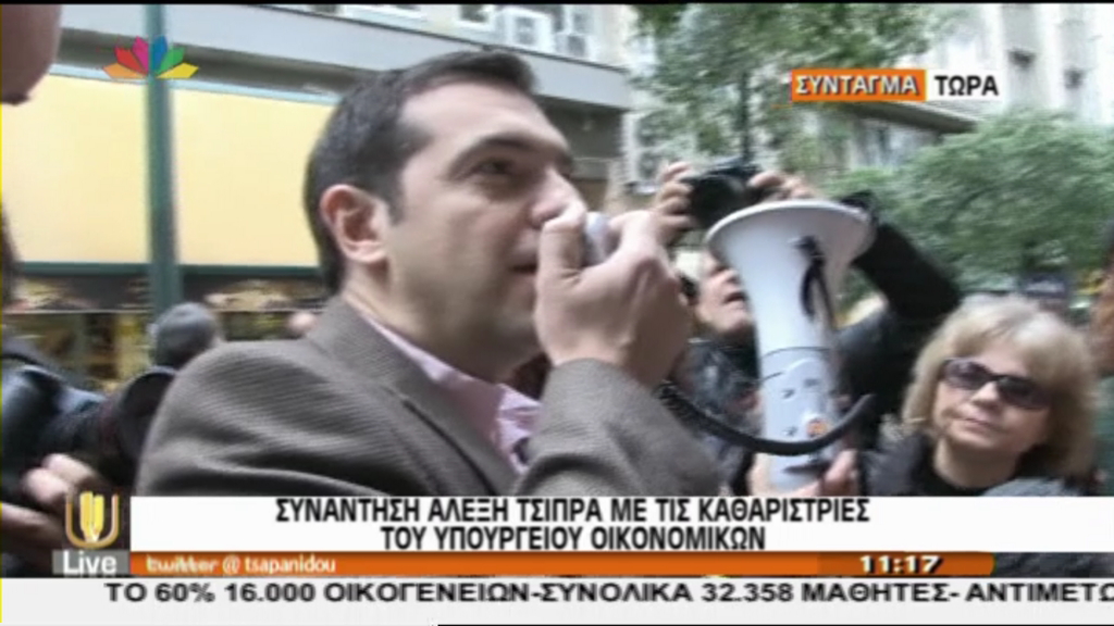 Θερμή υποδοχή επεφύλαξαν οι καθαρίστριες του υπουργείου Οικονομικών στον Αλέξη Τσίπρα, τις οποίες συνάντησε, για να εκφράσει τη συμπαράστασή του στον αγώνα τους.