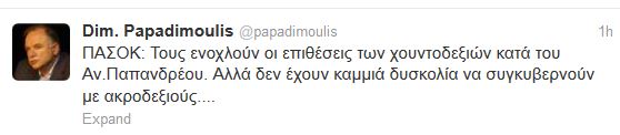 “ΠΑΣΟΚ: Τους ενοχλούν οι επιθέσεις των χουντοδεξιών κατά του Αν.Παπανδρέου. Αλλά δεν έχουν καμμιά δυσκολία να συγκυβερνούν με ακροδεξιούς….” έγραψε ο κοινοβουλευτικός εκπρόσωπος του ΣΥΡΙΖΑ στο Twitter.