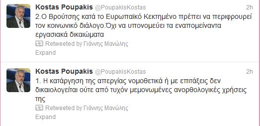 Αξίζει μάλιστα να αναφερθεί ότι τον κ. Πουπάκη έκανε“retweet” ο πρώην γραμματέας Συνδικαλιστικού της ΝΔ και μέλος πλέον της νεοσύστατης «Ελλήνων Πρωτοβουλία» Γιάννης Μανώλης.