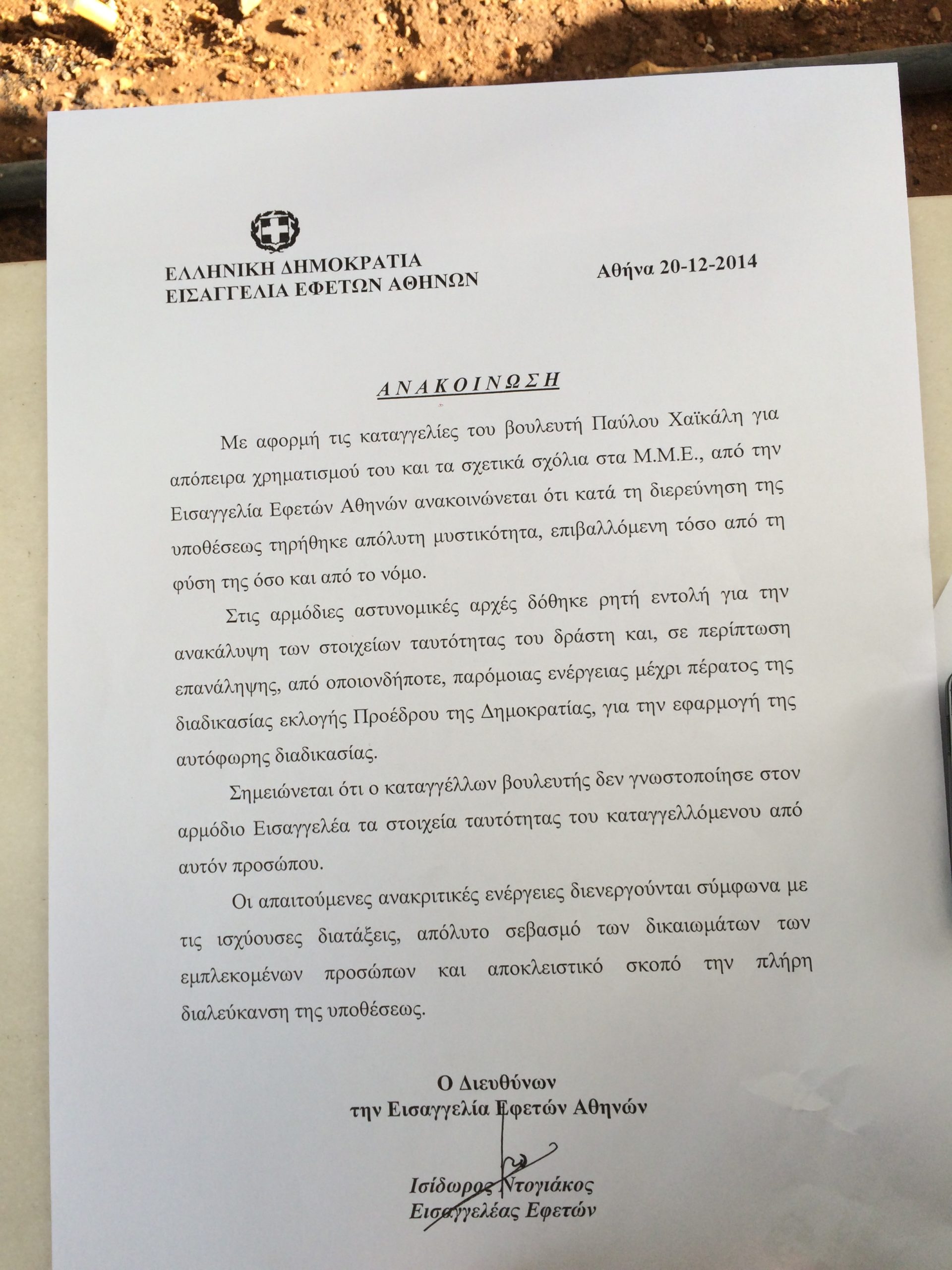 «Με αφορμή τις καταγγελίες του βουλευτή Παύλου Χαϊκάλη για απόπειρα χρηματισμού του και τα σχετικά σχόλια στα ΜΜΕ από την Εισαγγελία Εφετών Αθηνών ανακοινώνεται ότι κατά τη διερεύνηση της υποθέσεως τηρήθηκε απόλυτη μυστικότητα επιβαλλόμενη τόσο από τη φύση της όσο και από το νόμο», ανέφερε αρχικά ο κ. Ντογιάκος και συνέχισε: