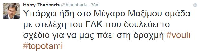 «Υπάρχει ήδη στο Μέγαρο Μαξίμου ομάδα με στελέχη του ΓΛΚ που δουλεύει το σχέδιο για να μας πάει στη δραχμή», έγραψε χαρακτηριστικά και στο twitter, αναπαράγοντας σημεία της ομιλίας του.