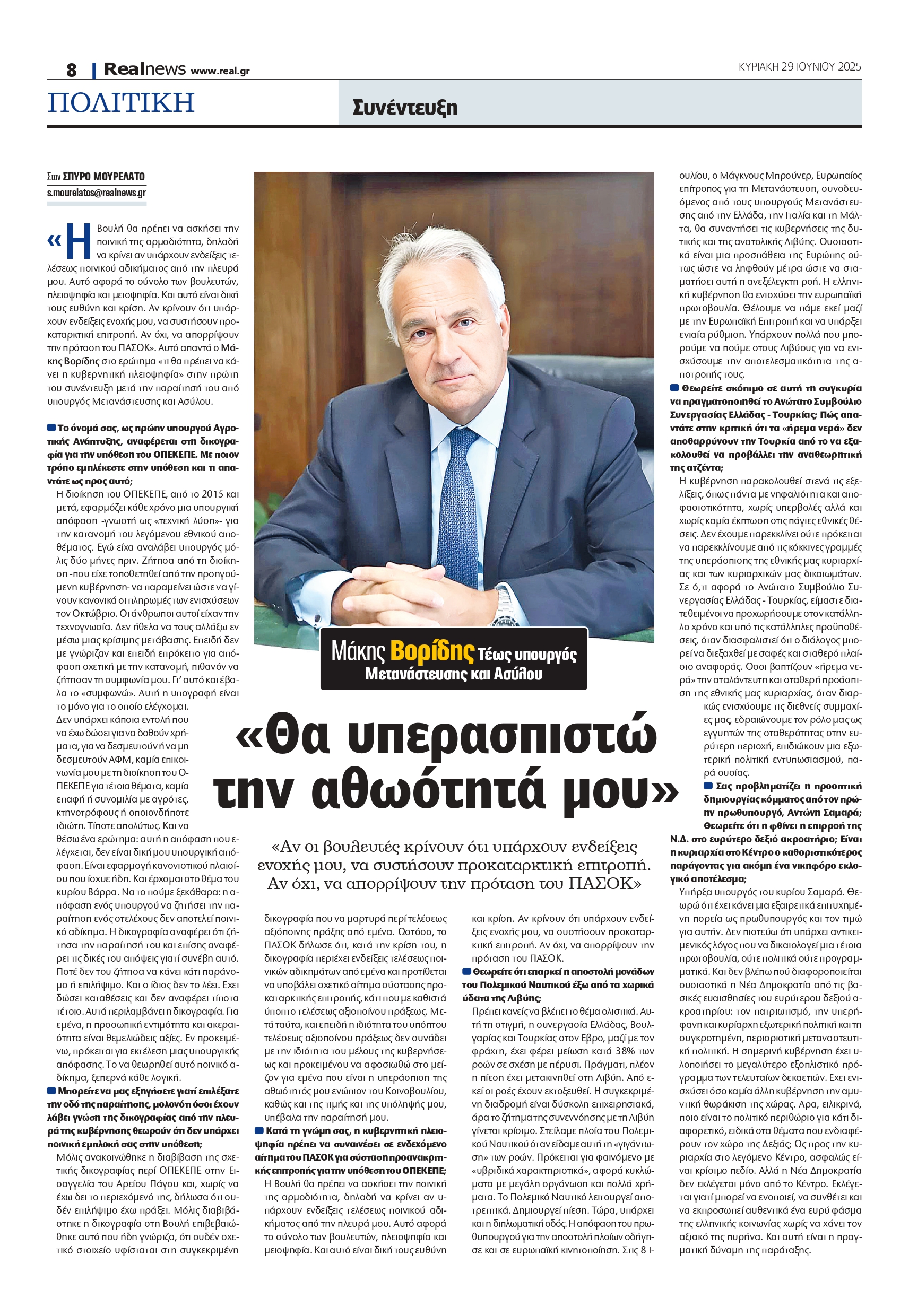 «H Βουλή θα πρέπει να ασκήσει την ποινική της αρμοδιότητα, δηλαδή να κρίνει αν υπάρχουν ενδείξεις τελέσεως ποινικού αδικήματος από την πλευρά μου. Αυτό αφορά το σύνολο των βουλευτών, πλειοψηφία και μειοψηφία. Και αυτό είναι δική τους ευθύνη και κρίση. Αν κρίνουν ότι υπάρχουν ενδείξεις ενοχής μου, να συστήσουν προκαταρκτική επιτροπή. Αν όχι, να απορρίψουν την πρόταση του ΠΑΣΟΚ». Αυτό απαντά ο Μάκης Βορίδης στο ερώτημα «τι θα πρέπει να κάνει η κυβερνητική πλειοψηφία» στην πρώτη του συνέντευξη μετά την παραίτησή του από υπουργός Μετανάστευσης και Ασύλου.