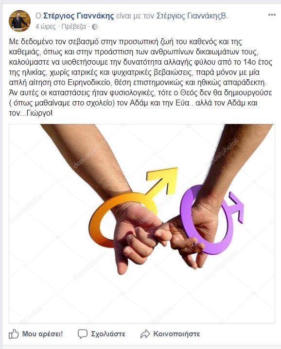 Μια ανάρτηση που θα συζητηθεί έκανε στο Facebook ο βουλευτής Πρεβέζης της Νέας Δημοκρατίας Στέργιος Γιαννάκης, όσον αφορά στο ζήτημα της ταυτότητας φύλου.