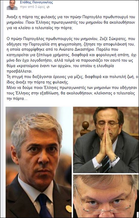 Με αφορμή τη φυλάκιση του πρώην πρωθυπουργού της Πορτογαλίας Ζοζέ Σόκρατες, ο βουλευτής του ΣΥΡΙΖΑ Στάθης Παναγούλης με ανάρτησή του στην προσωπική του σελίδα στο Facebook διερωτάται ποιοι Έλληνες βουλευτές θα ακολουθήσουν το δρόμο του.