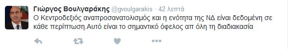Ο κ.Βουλγαράκης αναφέρει: «Ο Κεντροδεξιός αναπροσανατολισμός και η ενότητα της ΝΔ είναι δεδομένη σε κάθε περίπτωση. Αυτό είναι το σημαντικό όφελος απ όλη τη διαδικασία».
