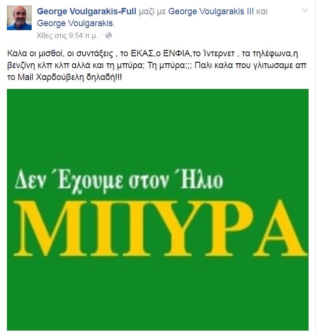 «Καλά οι μισθοί, οι συντάξεις, το ΕΚΑΣ, ο ΕΝΦΙΑ, το Ίντερνετ, τα τηλέφωνα, η βενζίνη… αλλά και τη μπύρα; Τη μπύρα; Πάλι καλά που γλιτώσαμε απ το email Χαρδούβελη δηλαδή», αναφέρει χαρακτηριστικά ο κ. Βουλγαράκης και ανέβασε μία φωτογραφία η οποία γράφει: “Δεν έχουμε στον ήλιο… μπύρα”.