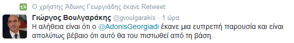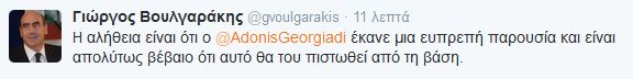 Ο κ.Βουλγαράκης σχολίασε για τον Άδωνι Γεωργιάδη στο Twitter: «Η αλήθεια είναι ότι ο Άδωνις Γεωργιάδης έκανε μια ευπρεπή παρουσία και είναι απολύτως βέβαιο ότι αυτό θα του πιστωθεί από τη βάση».