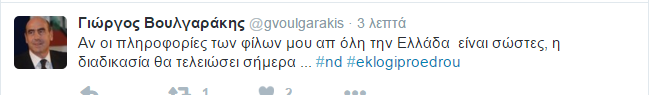 Την εκλογική διαδικασία για την ανάδειξη του Προέδρου της Νέας Δημοκρατίας, σχολίασε ο Γιώργος Βουλγαράκης με ανάρτηση του στο Twitter, επισημαίνοντας ότι «η διαδικασία θα τελειώσει σήμερα». Συγκεκριμένα, ο κ. Βουλγαράκης, έγραψε: «Αν οι πληροφορίες των φίλων μου από όλη την Ελλάδα είναι σωστές, η διαδικασία θα τελειώσει σήμερα».