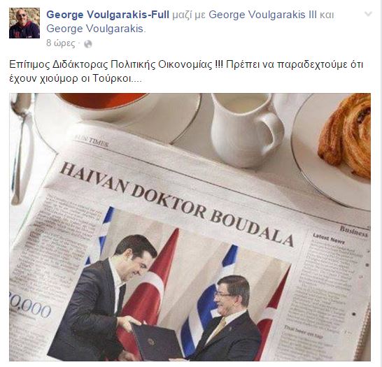 Την τελετή αναγόρευσης του Έλληνα Πρωθυπουργού, Αλέξη Τσίπρα, σε επίτιμο διδάκτορα του Πανεπιστημίου Σμύρνης, σχολίασε ο πρώην βουλευτής της Νέας Δημοκρατίας Γιώργος Βουλγαράκης, με ανάρτηση που έκανε στον προσωπικό του λογαριασμό στο Facebook, επισημαίνοντας ότι οι Τούρκοι έχουν χιούμορ.