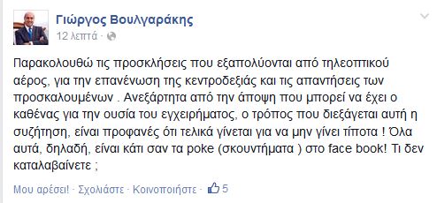 “Παρακολουθώ τις προσκλήσεις που εξαπολύονται από τηλεοπτικού αέρος, για την επανένωση της κεντροδεξιάς και τις απαντήσεις των προσκαλουμένων . Ανεξάρτητα από την άποψη που μπορεί να έχει ο καθένας για την ουσία του εγχειρήματος, ο τρόπος που διεξάγεται αυτή η συζήτηση, είναι προφανές ότι τελικά γίνεται για να μην γίνει τίποτα ! Όλα αυτά, δηλαδή, είναι κάτι σαν τα poke (σκουντήματα ) στο facebook! Τι δεν καταλαβαίνετε ;” έγραψε ο πρώην υπουργός.