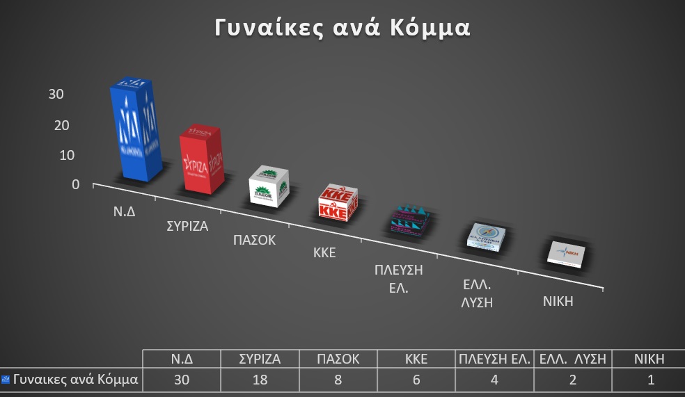 Όσον αφορά την ποσοστιαία αναλογία γυναικών/ανδρών βουλευτών , μεταξύ των κομμάτων την καλλίτερη αναλογία εμφανίζει η Πλεύση Ελευθερίας με 50% και ακολουθούν ΣΥΡΙΖΑ με 38%, και ΚΚΕ με 28,6%. Ειδικότερα, η νέα Βουλή αποτελείται από 69 γυναίκες βουλευτές. Από αυτές με την ΝΔ ανεδείχθησαν 30 σε σύνολο 158 βουλευτών (ποσοστό 19%), με το ΣΥΡΙΖΑ 18 σε σύνολο 47 (ποσοστό 38%), με το ΠΑΣΟΚ-Κίνημα Αλλαγής 8 σε σύνολο 32 (ποσοστό 25%), με το ΚΚΕ 6 σε σύνολο 21 (ποσοστό 28,6%), με το κόμμα Σπαρτιάτες καμία, με την Ελληνική Λύση 2 σε σύνολο 12 (ποσοστό 16,6%), με το κόμμα Νίκη μία σε σύνολο 10 (ποσοστό 10%) και με την Πλεύση Ελευθερίας 4 σε σύνολο 8 (ποσοστό 50%).