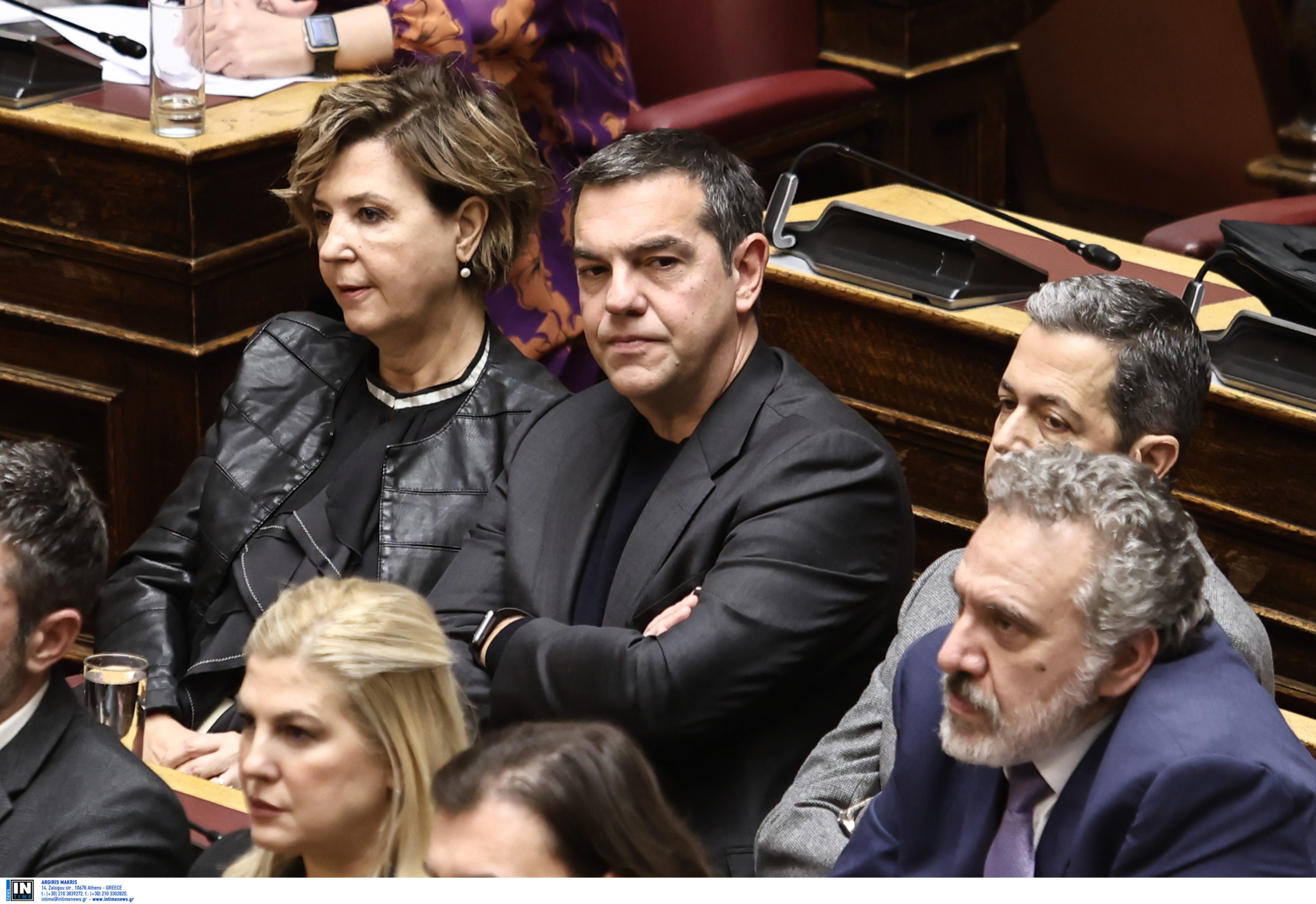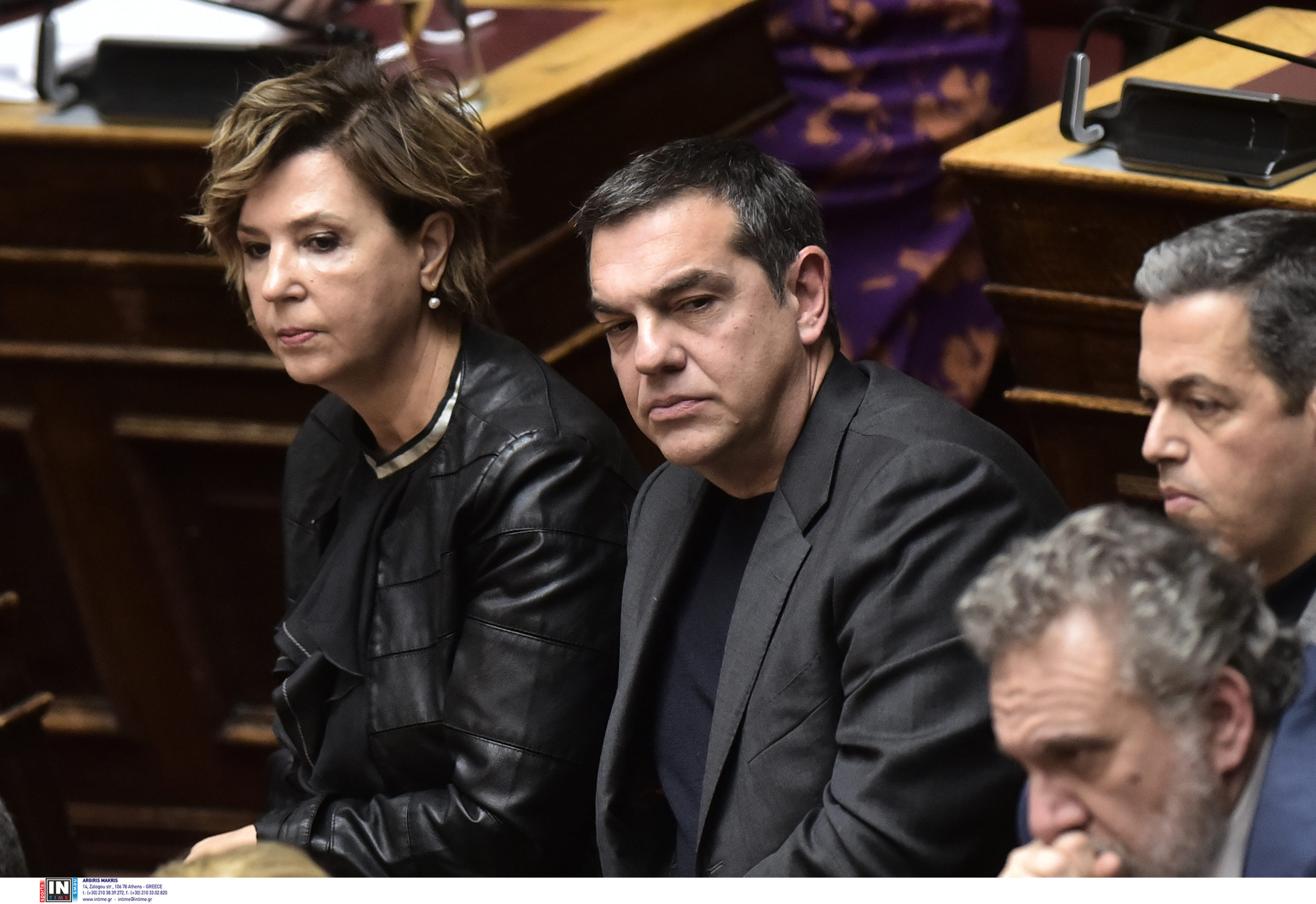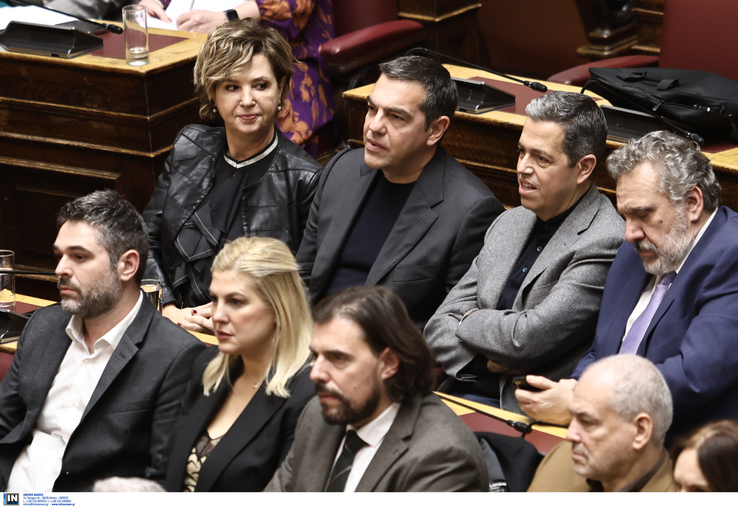 Δίπλα στον Αλέξη Τσίπρα κάθισαν η Όλγα Γεροβασίλη και ο Χάρης Μαμουλάκης. Στα στιγμιότυπα ο πρώην πρόεδρος του ΣΥΡΙΖΑ φαίνεται σκυθρωπός και προβληματισμένος.