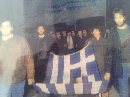 Ακριβώς από κάτω, ο Σταύρος Κοντονής, σε πορεία του Πολυτεχνείου να κρατά το σύμβολο της εξέγερσης, την ματωμένη σημαία του Πολυτεχνείου. Διακρίνεται πίσω αριστερά.