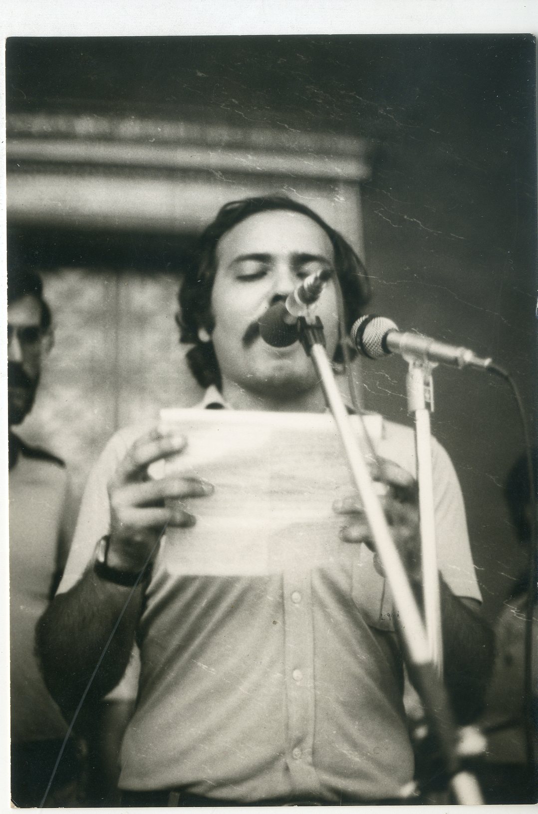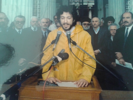 Πύρινο λόγο σε εκδήλωση για τον εορτασμό της Επετείου του Πολυτεχνείου απευθύνει από το βήμα εδώ, ως φοιτητής ακόμα, ο σημερινός υφυπουργός Πολιτισμού και Αθλητισμού Σταύρος Κοντονής.