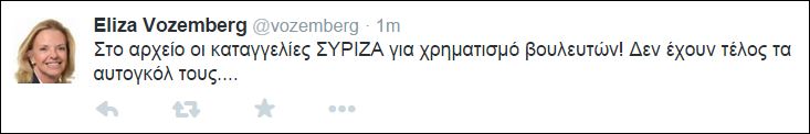 «Στο αρχείο οι καταγγελίες ΣΥΡΙΖΑ για χρηματισμό βουλευτών! Δεν έχουν τέλος τα αυτογκόλ τους….», έγραψε η Ελίζα Βόζεμπεργκ.