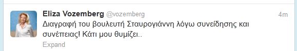 Η πρώην βουλευτής της ΝΔ, Ελίζα Βόζεμπεργκ, γράφει στον προσωπικό της λογαριασμό στο Twitter: «Διαγραφή του βουλευτή Σταυρογιάννη λόγω συνείδησης και συνέπειας! Κάτι μου θυμίζει…»
