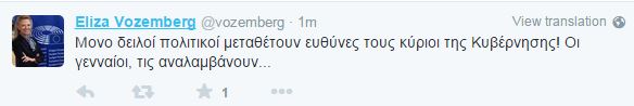 “Μόνο δειλοί πολιτικοί μεταθέτουν ευθύνες τους κύριοι της κυβέρνησης! Οι γενναίοι, τις αναλαμβάνουν…”, έγραψε χαρακτηριστικά στον προσωπικό της λογαριασμό στο twitter.