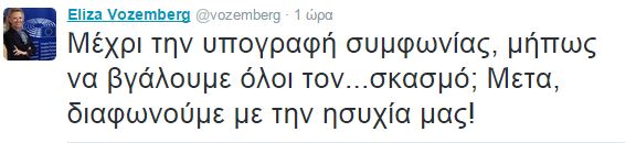 Έκκληση σε όλους να …σιωπήσουν, μέχρι την υπογραφή της συμφωνίας έκανε μέσω του λογαριασμού της στο twitter, η ευρωβουλευτής της ΝΔ, Ελίζα Βοζενμπεργκ: