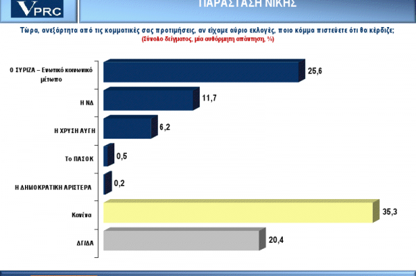 Πρώτο κόμμα στην εκτίμηση εκλογικής επιρροής αναδεικνύεται ο ΣΥΡΙΖΑ με 30,5%, σύμφωνα με δημοσκόπηση της VPRC που δημοσιεύεται στην εφημερίδα «Ελλάδα Αύριο», ενώ ο ΣΥΡΙΖΑ προηγείται και στην παράσταση νίκης με 25,6% έναντι 11,7% της ΝΔ.