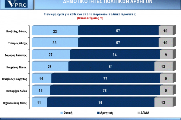 Σε ότι αφορά την δημοτικότητα των πολιτικών αρχηγών, το μεγαλύτερο ποσοστό σε θετικές γνώμες , 33%, συγκεντρώνουν ο Φώτης Κουβέλης και ο Αλέξης Τσίπρας, ενώ ακολουθεί ο Αντώνης Σαμαράς με 27%.