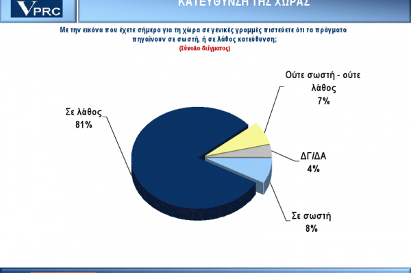 Το 81% των ερωτηθέντων πιστεύει ότι τα πράγματα στη χώρα πηγαίνουν σε λάθος κατεύθυνση, ενώ το 78% απαντά ότι μάλλον διαφωνεί με τα νέα μέτρα.