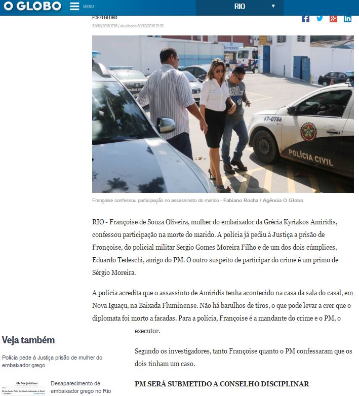 Την είδηση μεταδίδει το βραζιλιάνικο μέσο ενημέρωσης “O Globo”. Σύμφωνα με το ίδιο δημοσίευμα, οι αρχές εκτιμούν ότι το έγκλημα έγινε στο σπίτι του ζευγαριού στη Νόβα Ιγουάτσου, ενώ αναφέρουν ότι επειδή δεν ακούστηκαν πυροβολισμοί, όλα δείχνουν ότι ο διπλωμάτης μαχαιρώθηκε μέχρι θανάτου.