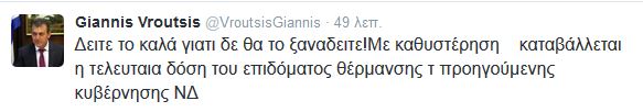 Ο κ.Βρούτσης έγραψε στο Twitter: «Δείτε το καλά γιατί δε θα το ξαναδείτε! Με καθυστέρηση καταβάλλεται η τελευταία δόση του επιδόματος θέρμανσης της προηγούμενης κυβέρνησης ΝΔ.»