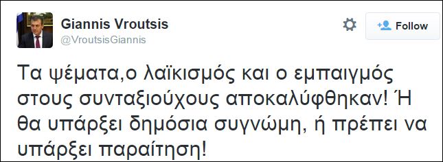Για ψέματα και εμπαιγμό των συνταξιούχων έκανε λόγο ο βουλευτής της ΝΔ Γιάννης Βρούτσης μέσα από το λογαριασμό του στο twitter.