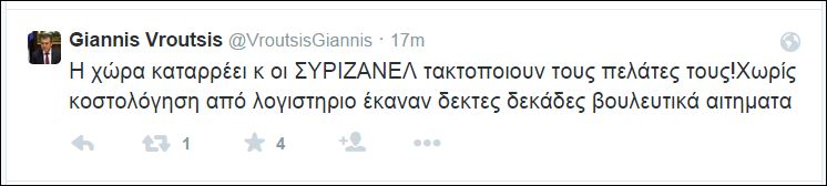 «Η χώρα καταρρέει και οι ΣΥΡΙΖΑΝΕΛ τακτοποιούν τους πελάτες τους! Χωρίς κοστολόγηση από λογιστήριο έκαναν δεκτές δεκάδες βουλευτικά αιτήματα» γράφει ο κ. Βρούτσης στον προσωπικό του λογαριασμό στο twitter, αναφερόμενος στο χθεσινό νομοσχέδιο για το δημόσιο, με το οποίο πέρασαν τροπολογίες οι οποίες χαρακτηρίστηκαν «φωτογραφικές» και «ρουσφετολογικές» από την αξιωματική αντιπολίτευση.