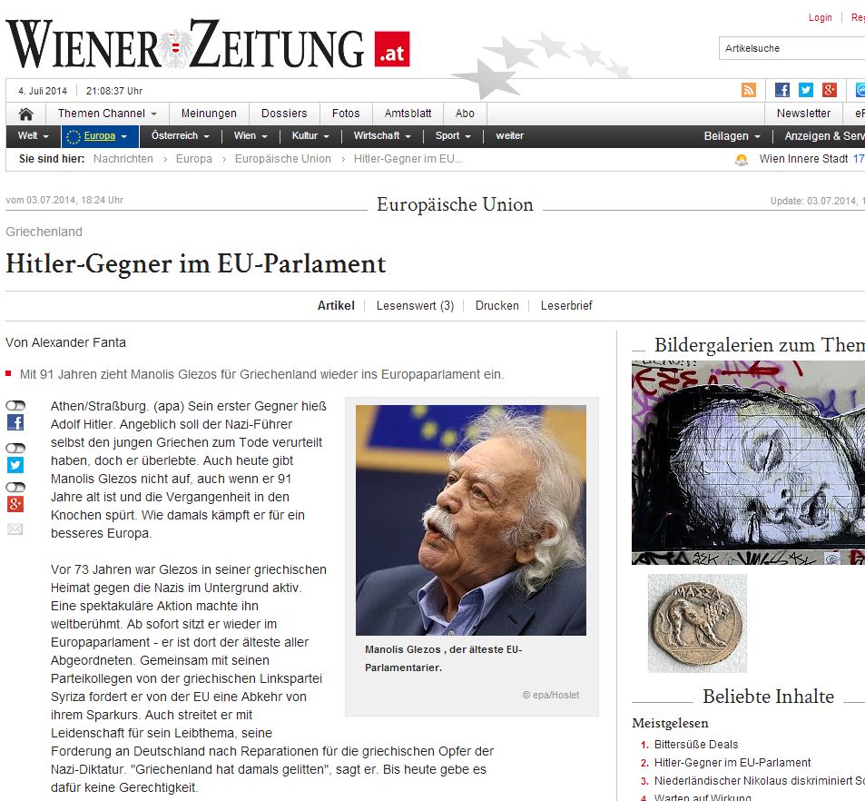 Τον χαρακτηριστικό τίτλο «Ο αντίπαλος του Χίτλερ στο Ευρωπαϊκό Κοινοβούλιο» έχει το εκτενές αφιέρωμα στον Μανώλη Γλέζο, στο σημερινό φύλλο της αυστριακής εφημερίδας «Βίνερ Τσάιτουνγκ», στον υπότιτλο του οποίου σημειώνεται πως «με τα 91 χρόνια του ο Μανώλης Γλέζος θα εκπροσωπήσει και πάλι την Ελλάδα στο Ευρωκοινοβούλιο».