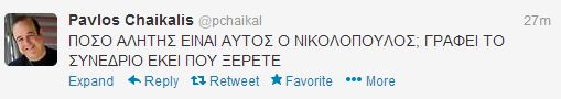 “Πόσο αλήτης είναι αυτός ο Νικολόπουλος; Γράφει το συνέδριο εκεί που ξέρετε”, ήταν το χαρακτηριστικό σχόλιο που έκανε ο βουλευτής των Ανεξάρτητων Ελλήνων, Παύλος Χαϊκάλης στον προσωπικό του λογαριασμό στο twitter, για τον Ανεξάρτητο Βουλευτή, Νίκο Νικολόπουλο.