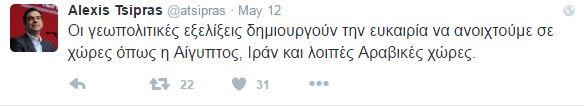 Συγκεκριμένα, το tweet στο «@atsipras» ανέφερε πως «οι γεωπολιτικές εξελίξεις δημιουργούν την ευκαιρία να ανοιχτούμε σε χώρες όπως η Αίγυπτος, Ιράν και λοιπές Αραβικές χώρες».