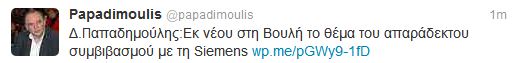 Στη Βουλή θα τεθεί ξανά το θέμα του εξωδικαστικού συμβιβασμού της κυβέρνησης με τη Siemens, σύμφωνα με ανάρτηση στο twitter από τον βουλευτή του ΣΥΡΙΖΑ, Δημήτρη Παπαδημούλη.Δείτε την ανάρτηση του κ. Παπαδημούλη.