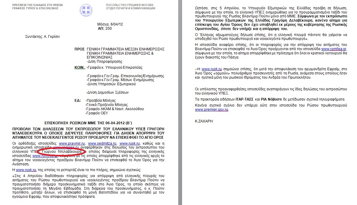 Με Δελτίο Τύπου που εξέδωσε σήμερα η Ελληνική Πρεσβεία στη Μόσχα, προσπαθεί να διαψεύσει τις πληροφορίες που πρώτος ο enikos μετέδωσε, για την ματαίωση της επίσκεψης Πούτιν στην Ελλάδα. Μία μικρή επισήμανση, είστε σίγουροι οτι ο εκπρόσωπος Τύπου του Υπουργείου Εξωτερικών ονομάζεται “Ντελαβέκουρας”; Μάλλον όχι και το επισςημαίνουμε γιατί πρώτα βγάλατε ένα Δελτίο Τύπου που είχε πάλι λάθος το όνομα του κ.Δελαβέκουρα και αμέσως μετά βγάλατε νέο για να το διορθώσετε και να το γράψετε πάλι λάθος.Α!και κάτι άλλο, μήπως τον λένε Γρηγόρη και όχι Γιώργο; Ελάτε ρε παιδιά να οργανωθούμε να κάνουμε ένα δελτίο Τύπου της προκοπής