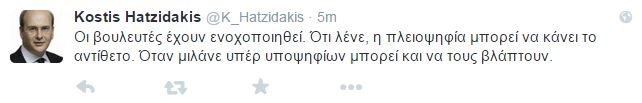 Mέσω του λογαριασμού του στο twitter o βουλευτής της ΝΔ, Κωστής Χατζηδάκης αναφέρεται στις δημόσιες τοποθετήσεις βουλευτών της ΝΔ σχετικά με την υποστήριξη τους στους υποψηφίους προέδρους, υποστηρίζοντας οτι “όταν μιλάνε υπερ υποψηφίων μπορεί και να τους βλαπτουν”: