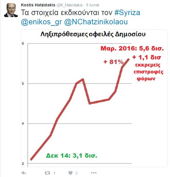 Ενδεικτικά, ο κ. Χατζηδάκης, ανήρτησε διαγράμματα, που αναφέρονται στη πορεία του ΑΕΠ τα τελευταία χρόνια, στην απορρόφηση των ευρωπαϊκών κονδυλίων, τις ξένες επενδύσεις καθώς και τις ληξιπρόθεσμες οφειλές του δημοσίου.
