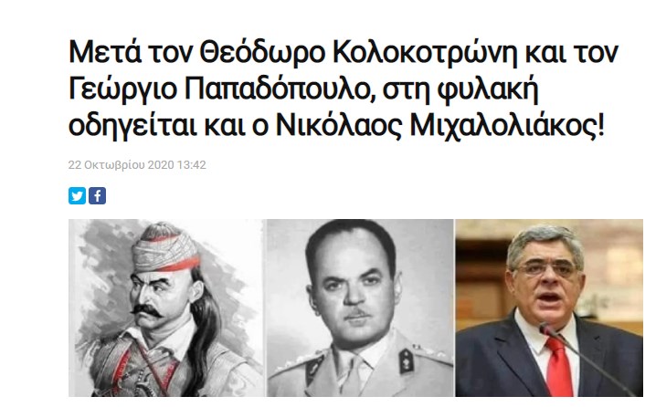 Το τερμάτισε η Χρυσή Αυγή. Κείμενο που αναρτήθηκε στην ιστοσελίδα του μορφώματος μετά την ιστορική απόφαση του δικαστηρίου, που οδηγεί στη φυλακή τα στελέχη του, παρομοιάζει τη φυλάκιση του Νίκου Μιχαλολιάκου με τη φυλάκιση του Θεόδωρου Κολοκοτρώνη, αλλά και του δικτάτορα Γεωργίου Παπαδόπουλου.