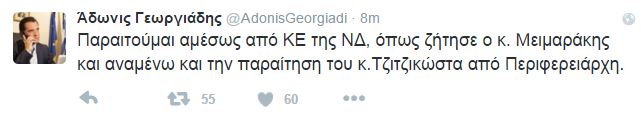 “Παραιτούμαι αμέσως από ΚΕ της ΝΔ, όπως ζήτησε ο κ. Μειμαράκης και αναμένω και την παραίτηση του κ.Τζιτζικώστα από Περιφερειάρχη”, έγραψε στον προσωπικό του λογαριασμό στο twitter ο κ. Γεωργιάδης.