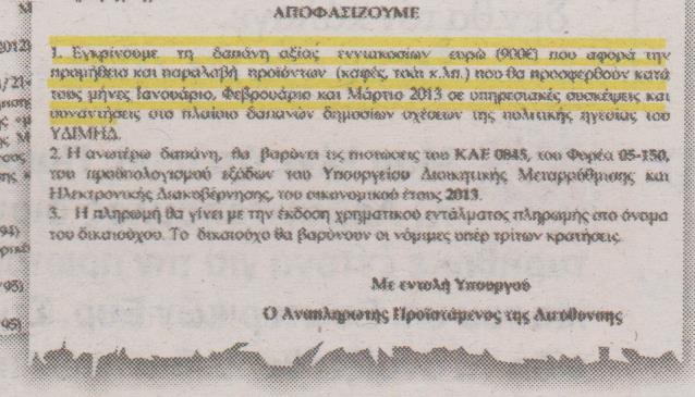 Οπως αναφέρεται στο δημοσίευμα, από έγγραφο που αναρτήθηκε στη “Διαύγεια”, το υπουργείο ενέκρινε τη δαπάνη των 900 ευρώ για προμήθεια και παραλαβή προϊόντων (καφές, τσάι κλπ.), που θα προσφερθούν κατά τους μήνες Ιανουάριο, Φεβρουάριο και Μάρτιο του 2013 σε υπηρεσιακές συσκέψεις και συναντήσεις στο πλαίσιο δαπανών δημοσίων σχέσεων του υπουργείου.