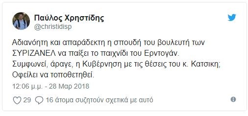«Αδιανόητη και απαράδεκτη η σπουδή του βουλευτή των ΣΥΡΙΖΑΝΕΛ να παίξει το παιχνίδι του Ερντογάν. Συμφωνεί, άραγε, η Κυβέρνηση με τις θέσεις του κ. Κατσικη; Οφείλει να τοποθετηθεί» αναφέρει χαρακτηριστικά ο εκπρόσωπος Τύπου του ΠΑΣΟΚ στο λογαριασμό που διατηρεί στο Twitter.