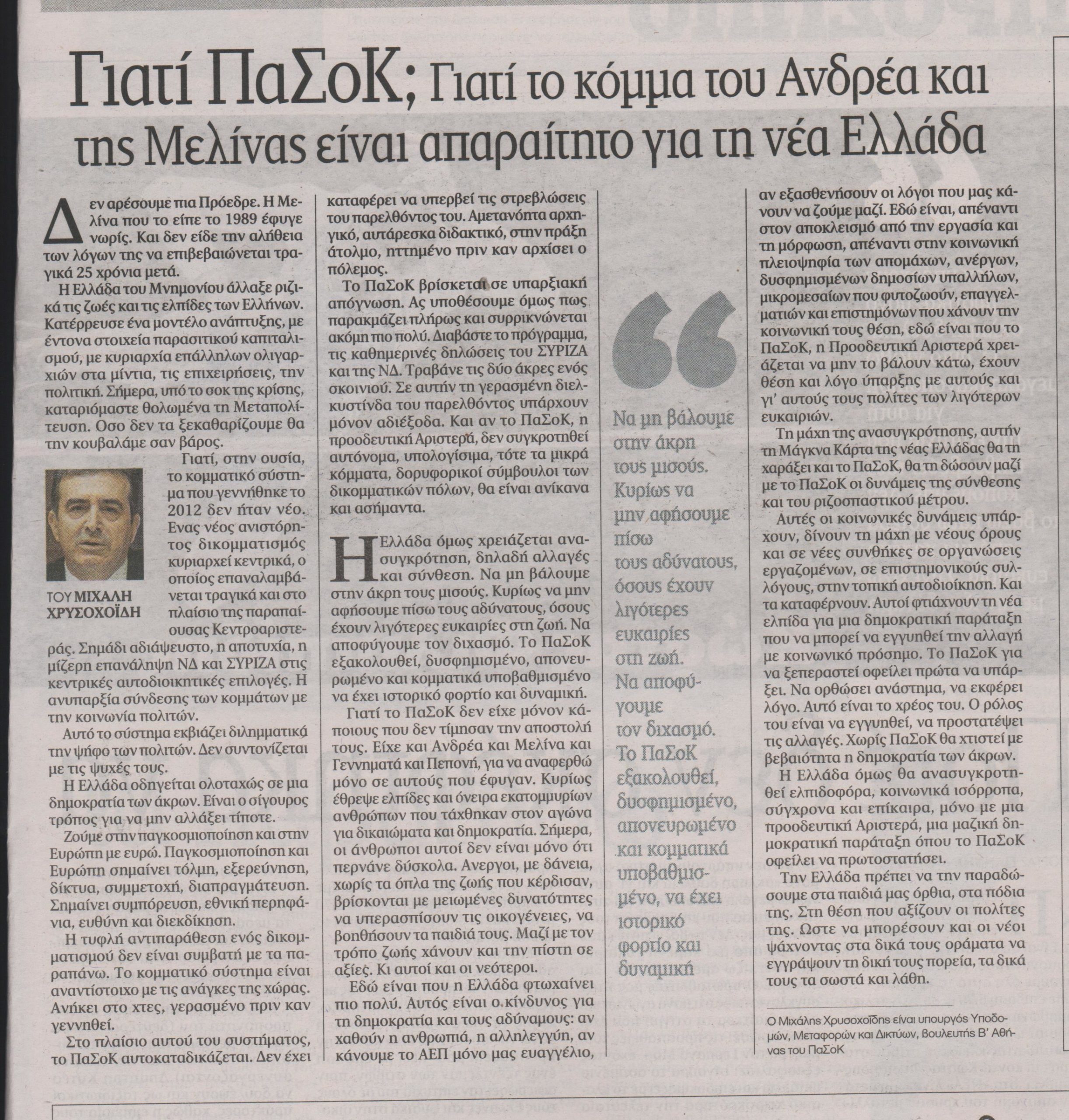 Σε άλλο σημείο του άρθρου του, ο κ. Χρυσοχοΐδης επισημαίνει: «Να μην βάλουμε στην άκρη τους μισούς. Κυρίως, να μην αφήσουμε πίσω τους αδύνατους, όσους έχουν λιγότερες ευκαιρίες στη ζωή. Να αποφύγουμε το διχασμό. Το ΠαΣοΚ εξακολουθεί, δυσφημισμένο, απονευρωμένο και κομματικά υποβαθμισμένο, να έχει ιστορικό φορτίο και δυναμική».