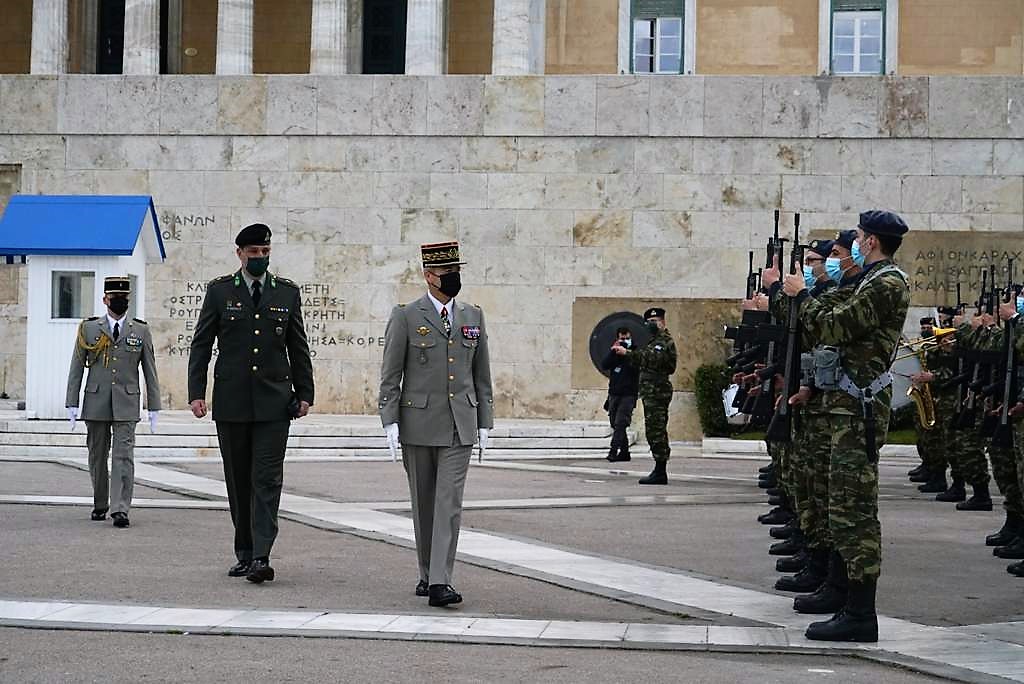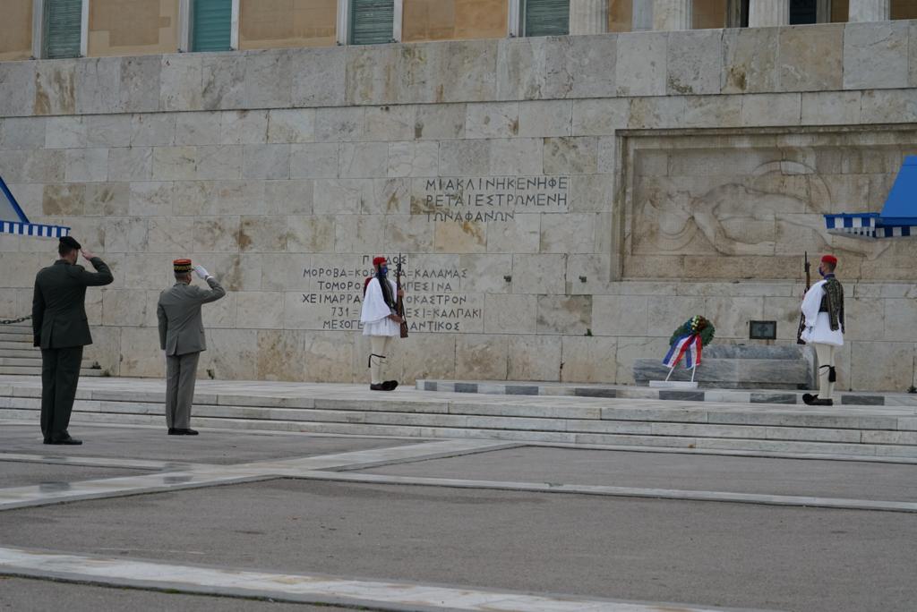 Πριν από την μετάβασή του στο Στρατόπεδο «ΠΑΠΑΓΟΥ» για την επίσημη υποδοχή και συνάντησή του με τον Αρχηγό ΓΕΕΘΑ, ο Αρχηγός του Επιτελείου Άμυνας της Γαλλίας κατέθεσε στεφάνι στο Μνημείο του Άγνωστου Στρατιώτη στην Πλατεία Συντάγματος.