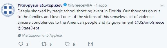 Με ανάρτησή του στο Twitter το υπουργείο Εξωτερικών αναφέρει: «Βαθιά σοκαρισμένοι από την τραγική επίθεση ενόπλου σε σχολείο στη Φλόριντα. Οι σκέψεις μας είναι στις οικογένειες και στους αγαπημένους των θυμάτων αυτής της παράλογης πράξης βίας. Τα ειλικρινή μας συλλυπητήρια στον αμερικανικό λαό και την κυβέρνησή του». Δείτε το tweet: